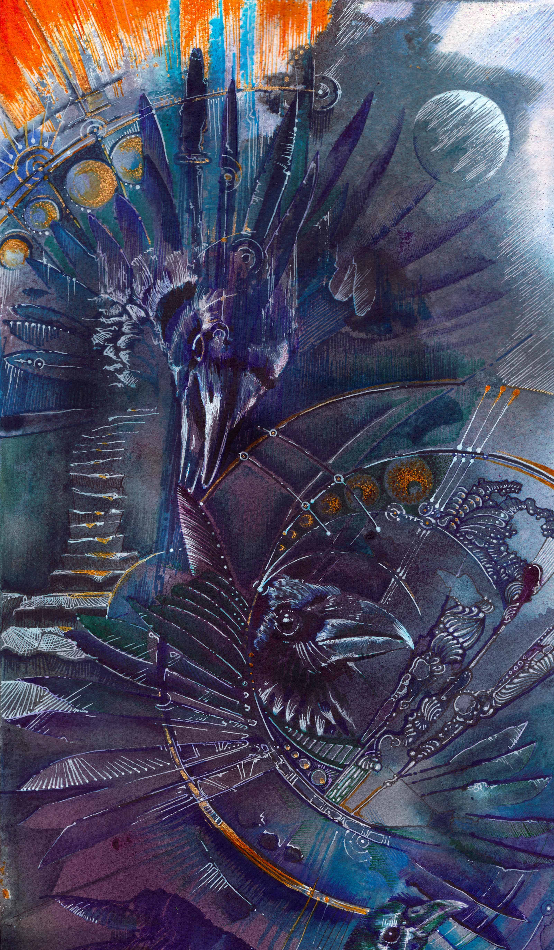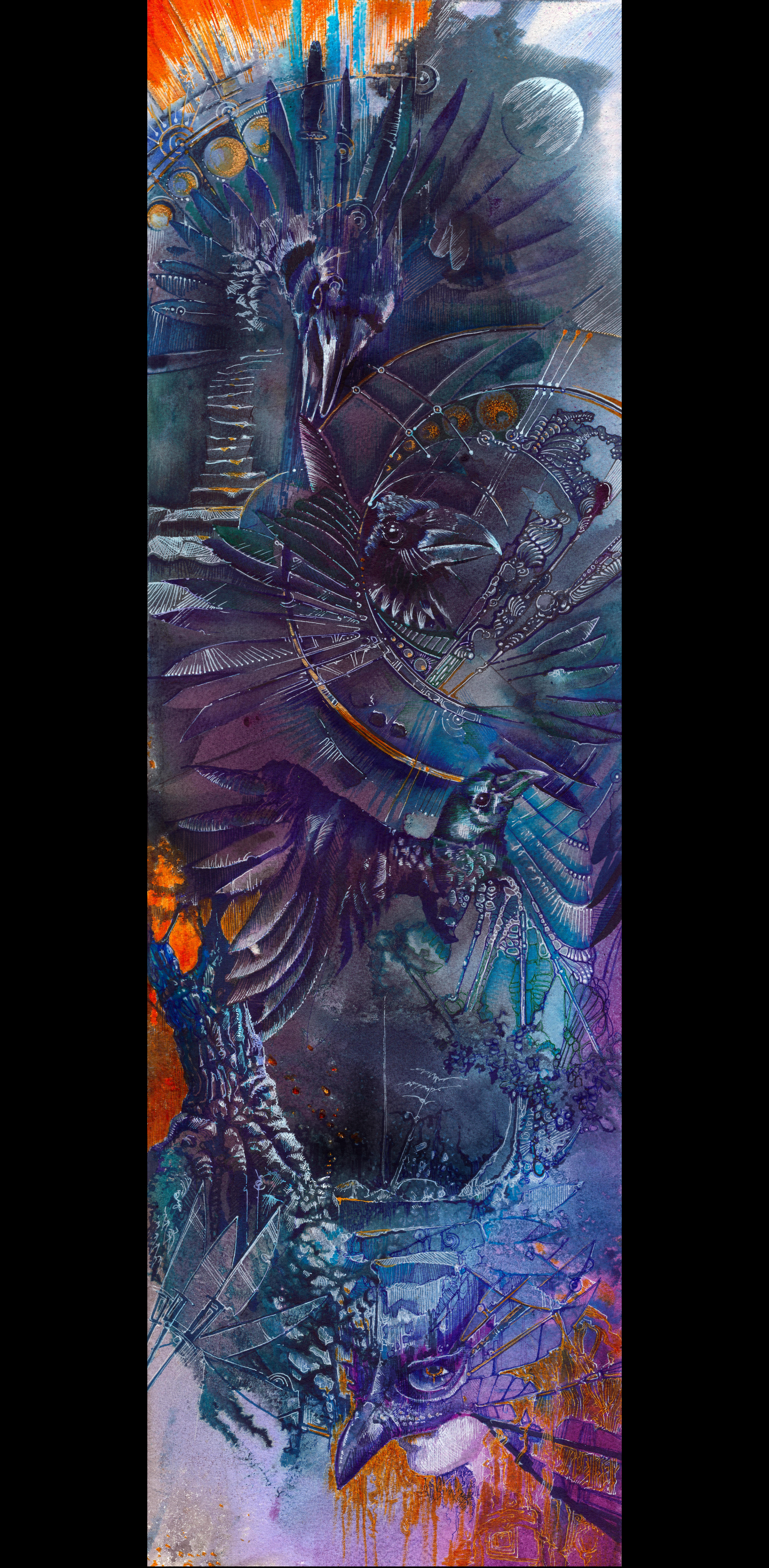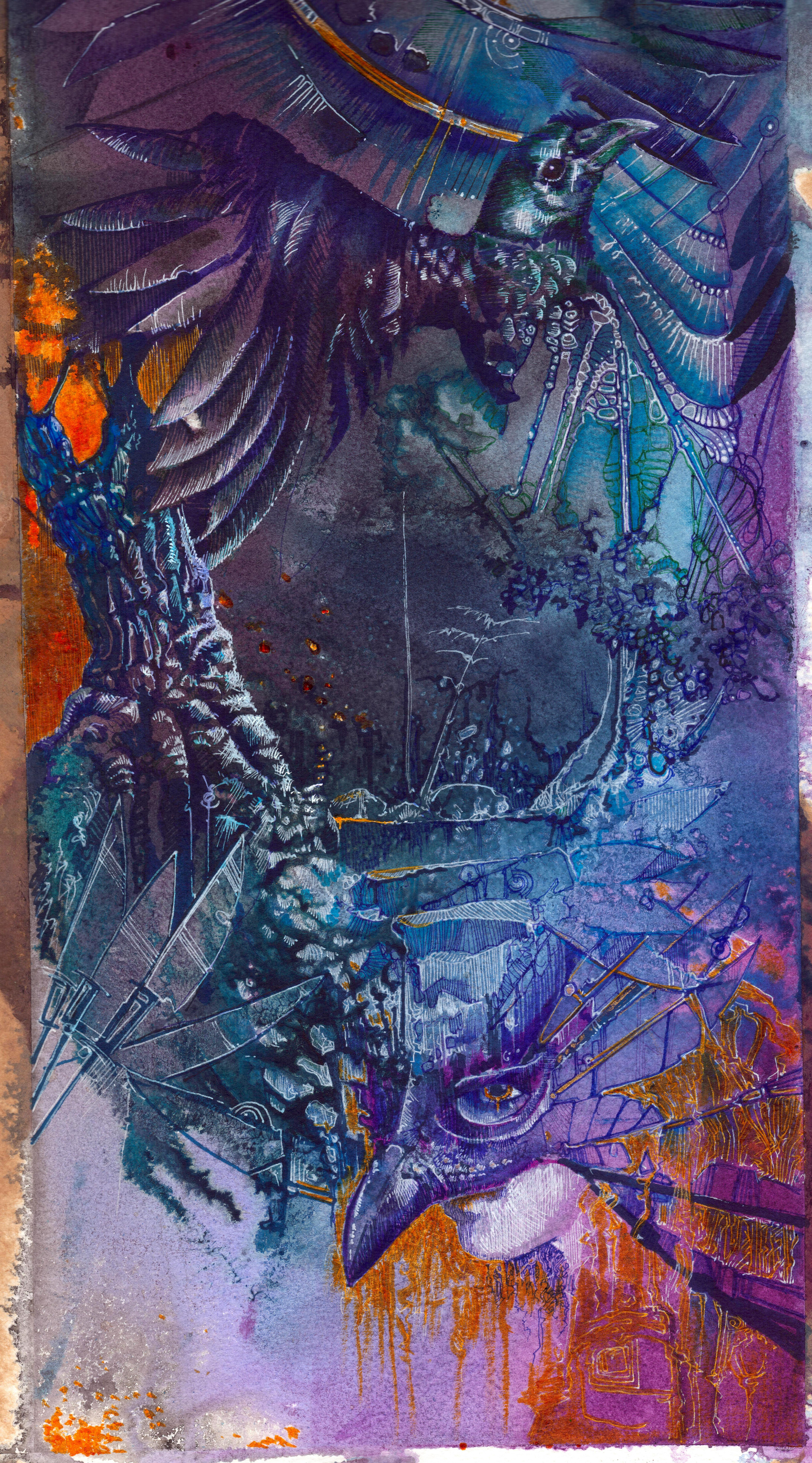 The Crow Road - do you know the way, or did you forget? Is it somewhere you visit in your dreams or somewhere that visit you? Dive into the darkness with this stunning deep purple watercolour, lit with gold and orange.