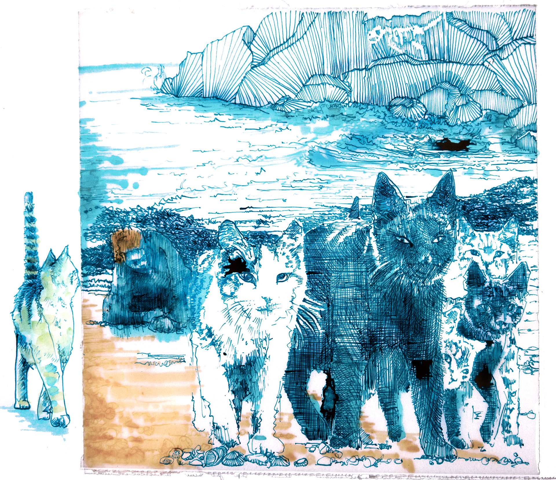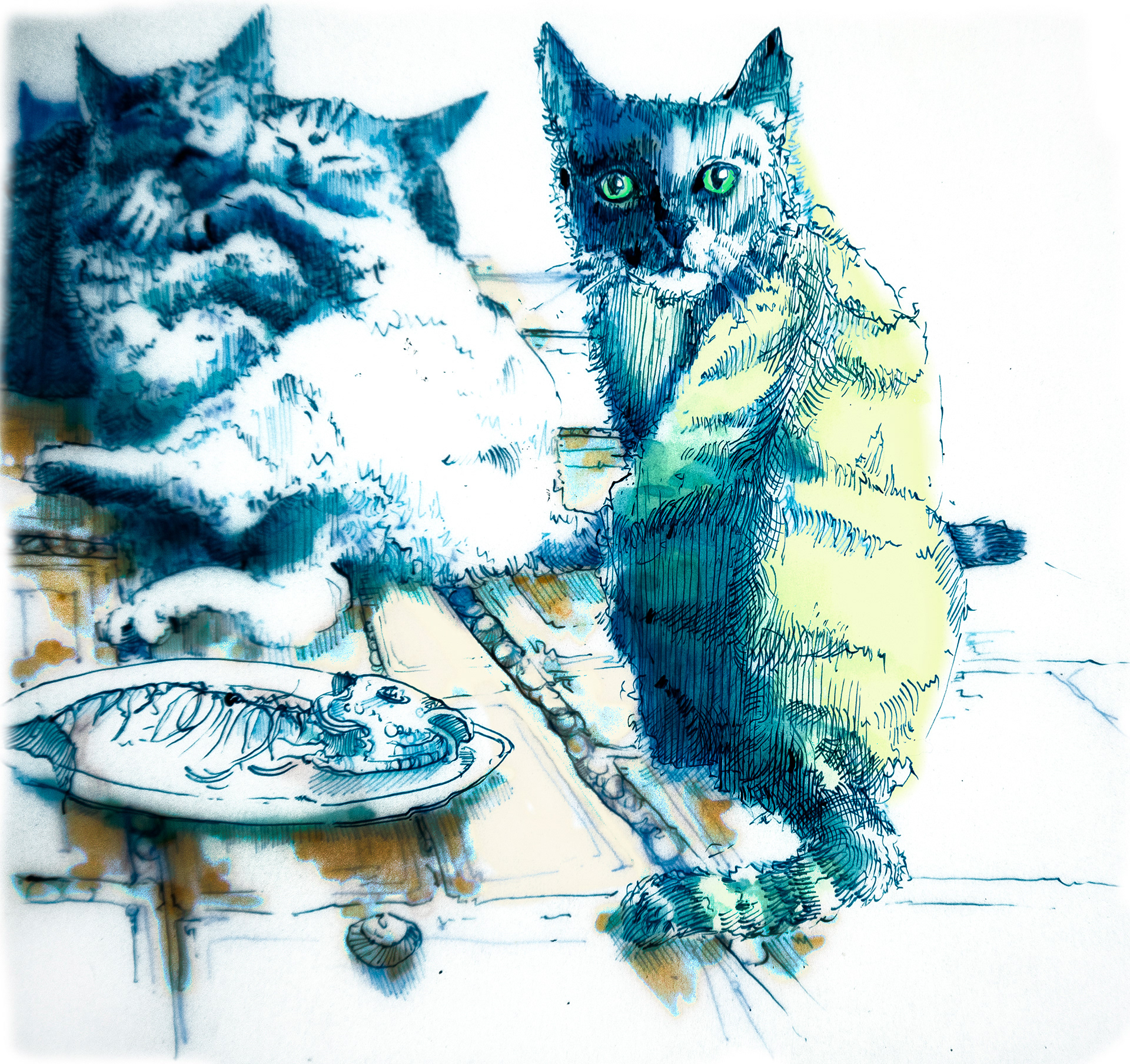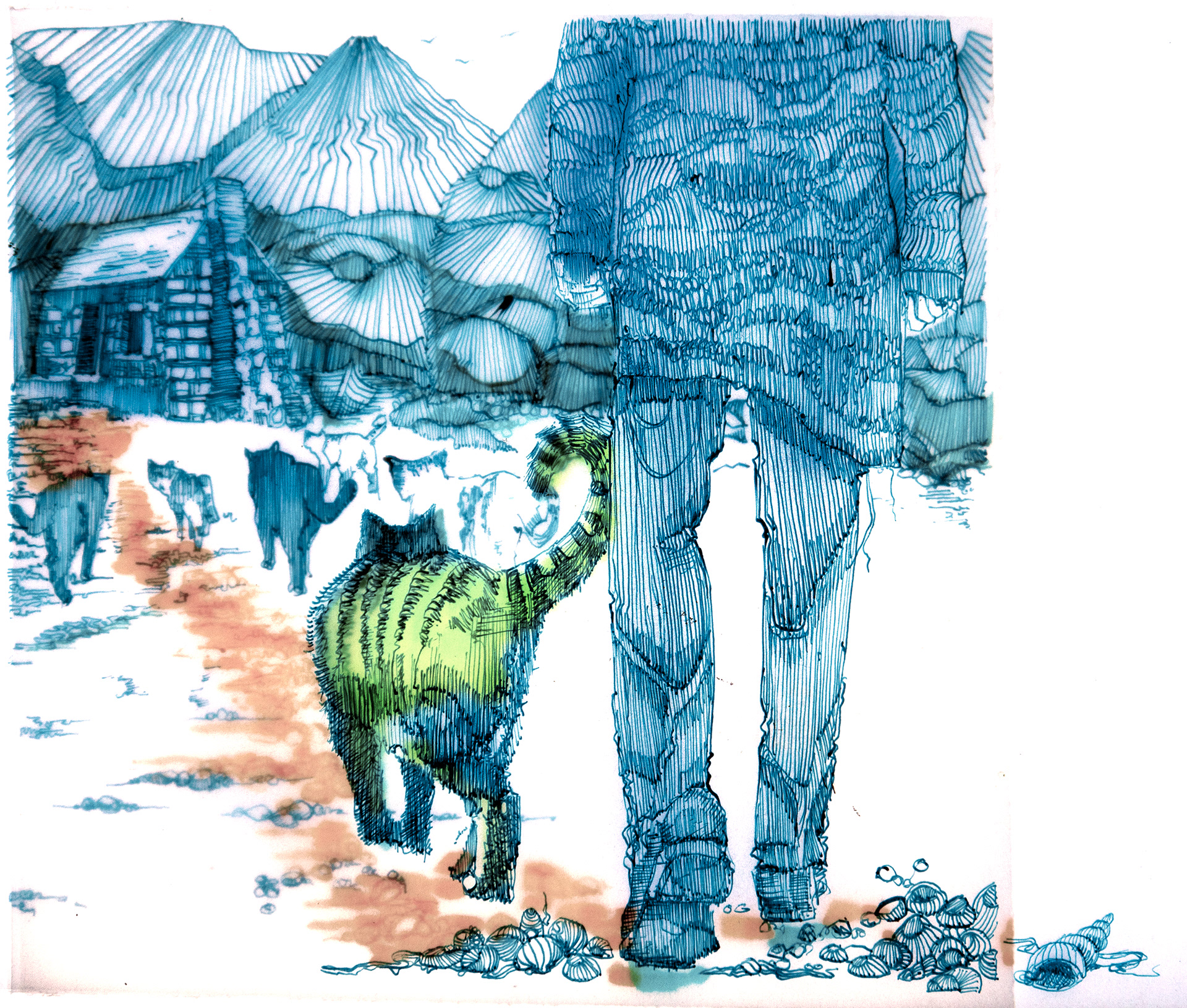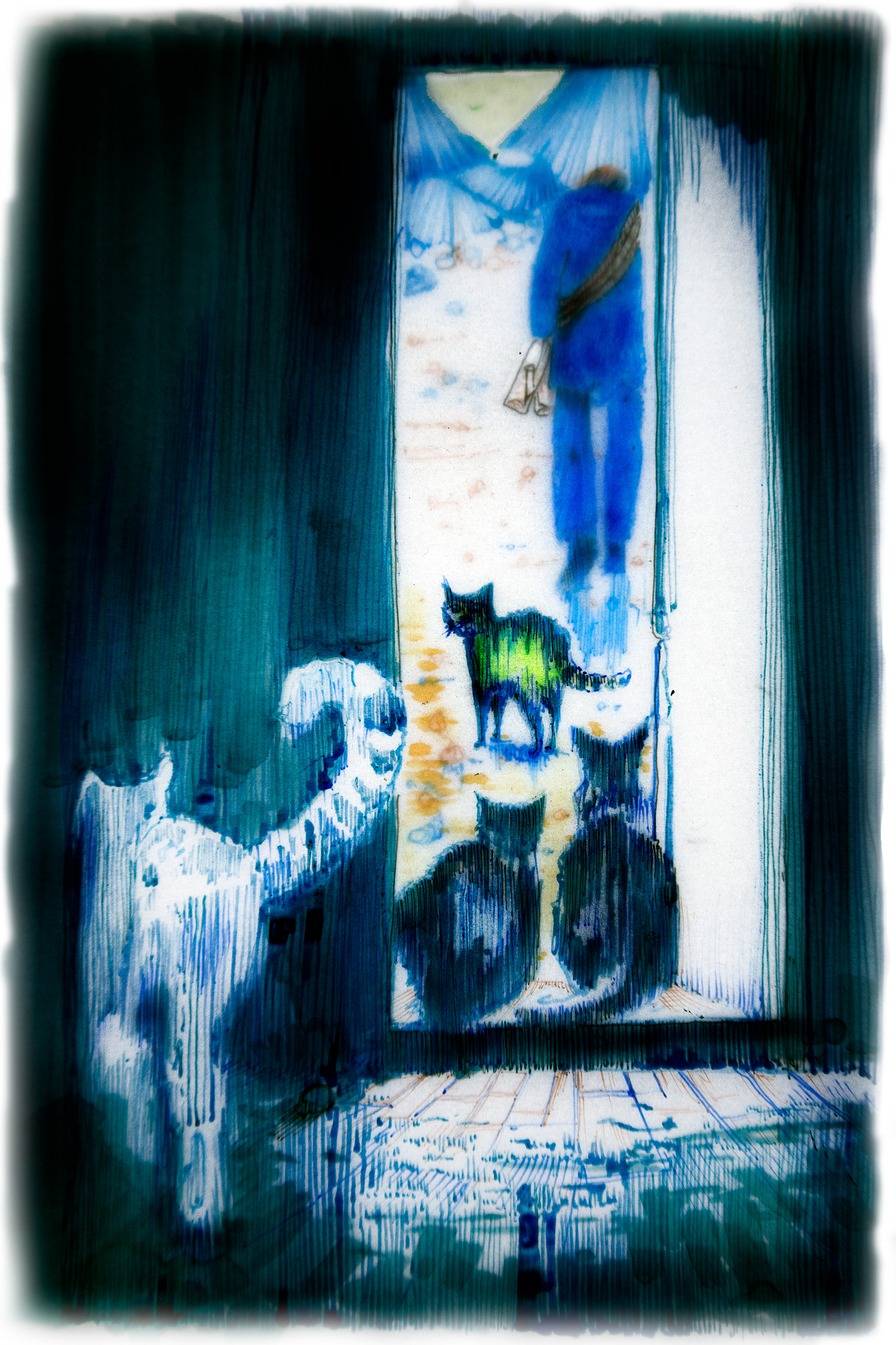 An unsettling narrative about death, delusion, contentment and cats. All the images are hand drawn in dip pen on layers of tracing paper and illuminated over a light