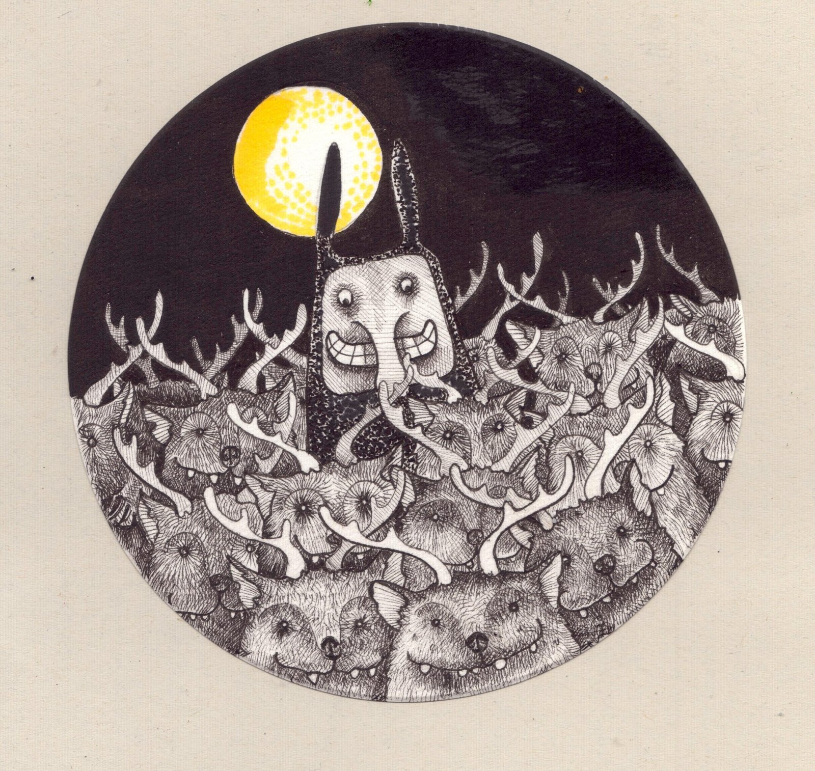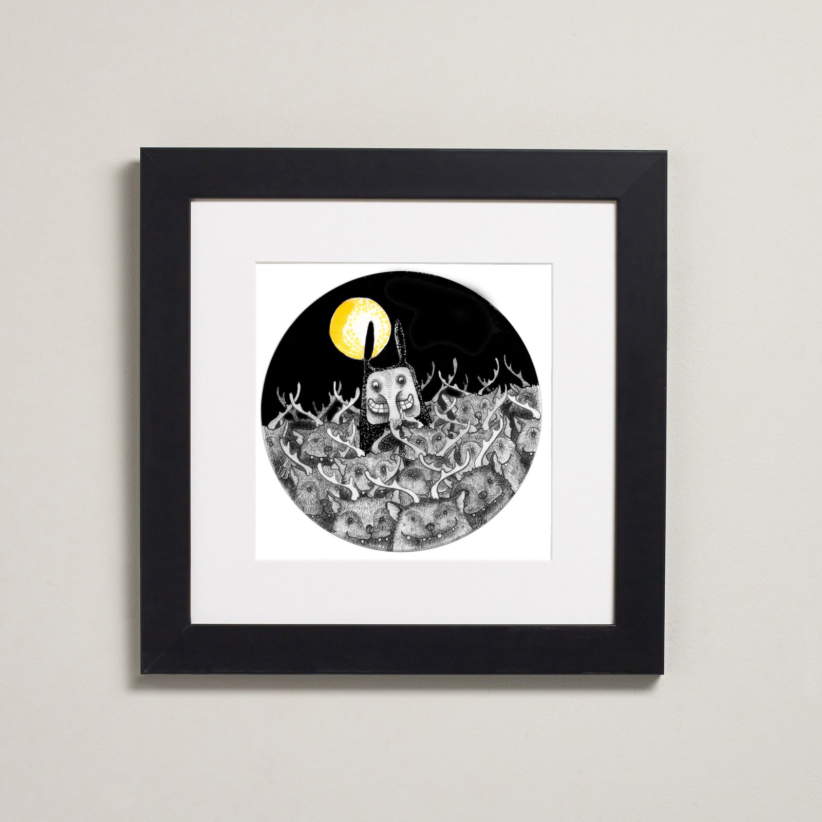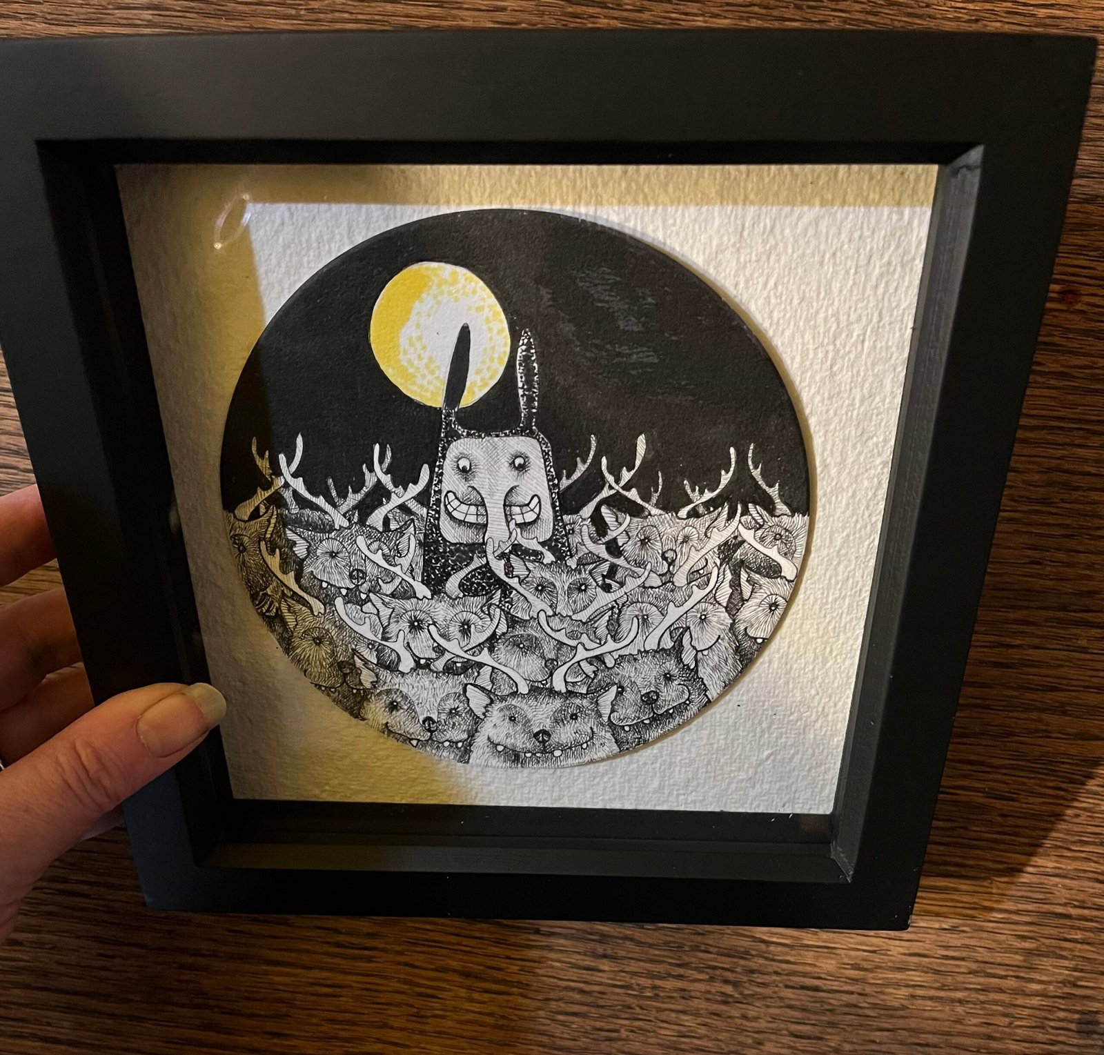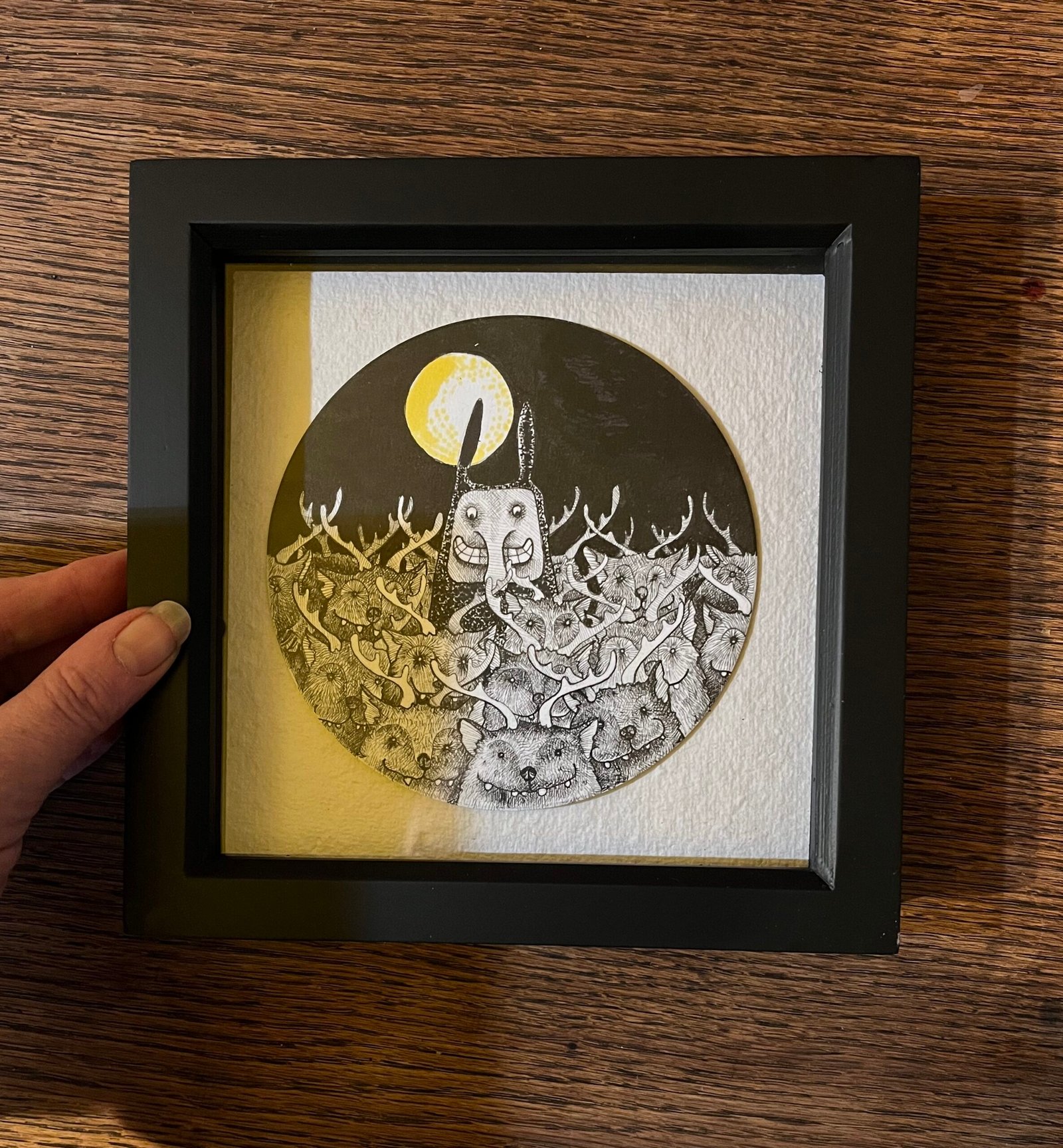 This is an original drawing on round paper which is then mounted on textured handmade paper, and framed in a box frame. The round image is 15 cm in diameter.