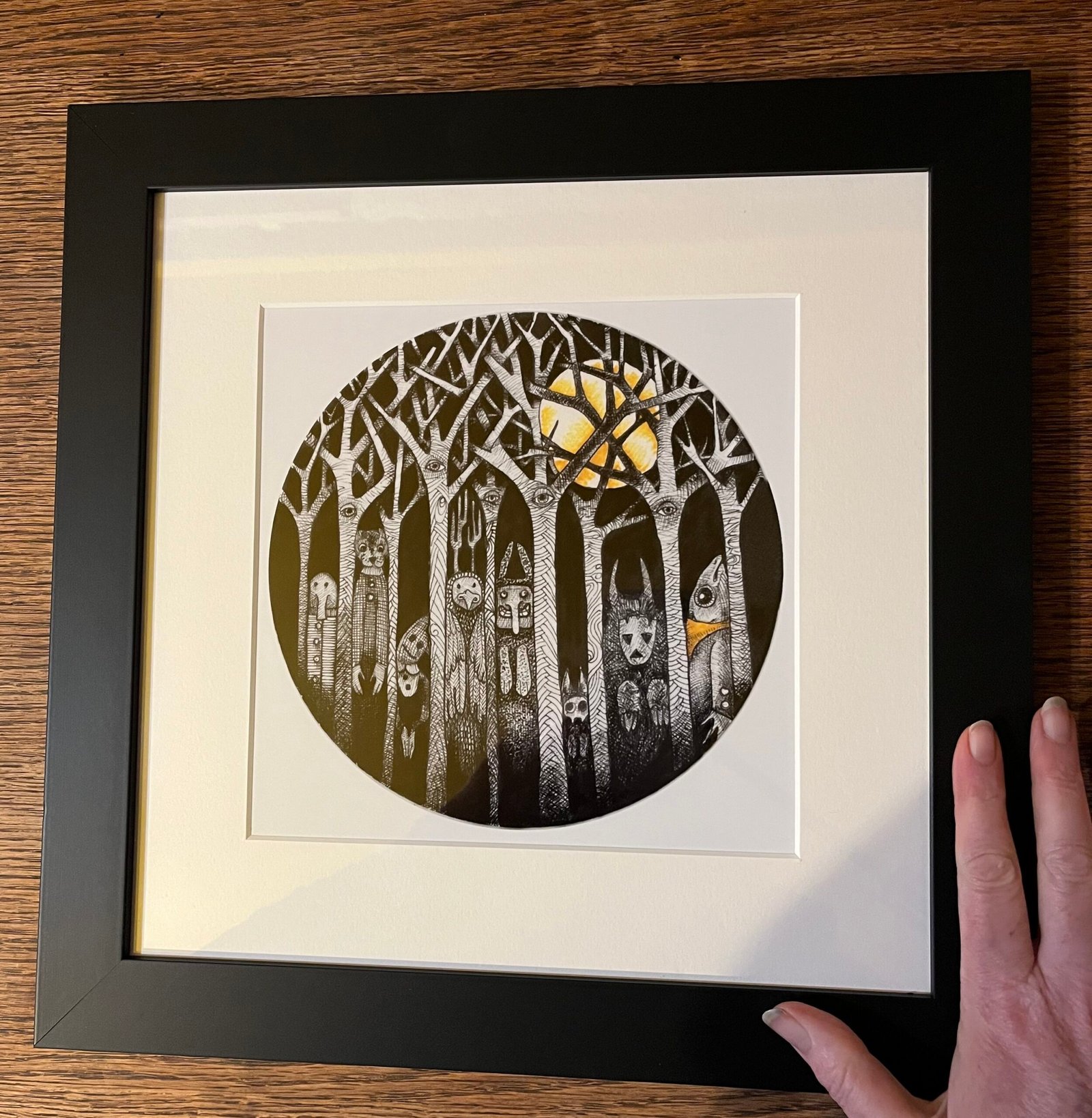 From around the Wild Wide Woods, a series of vignettes of the mysterious night time going’s-on. My original drawings are ink on paper, in black and white with hints of yellow, and this print collection is a high quality reproduction of each, framed in a 30 x 30 cm black frame glazed in acrylic and sent direct to you.