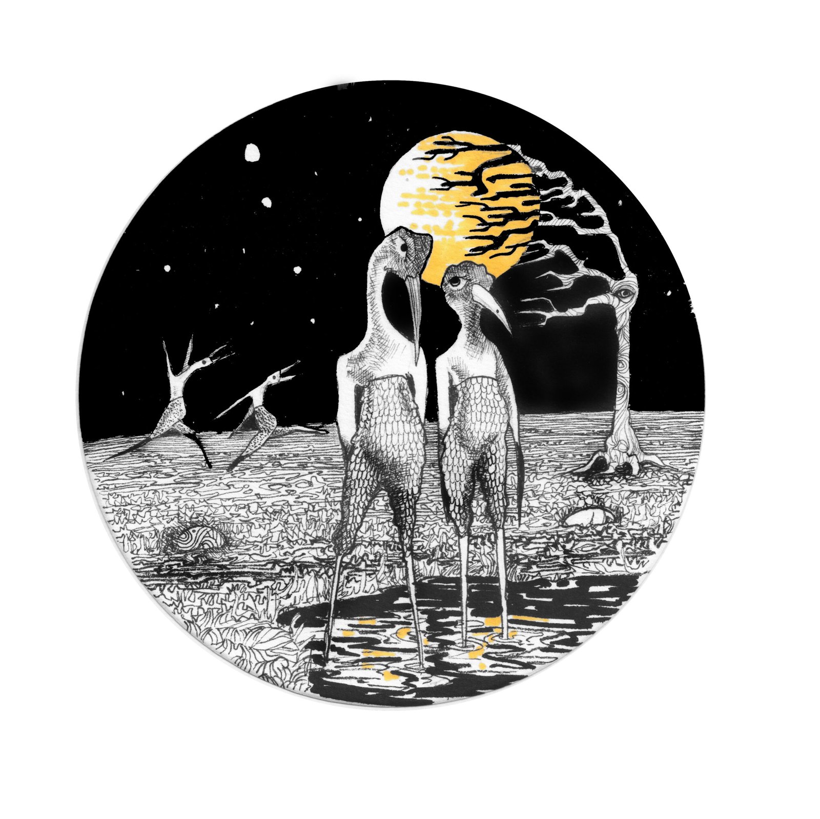 My original drawings are ink on paper, in black and white with hints of yellow, and this print collection is a high quality reproduction of each, either framed in a 30 x 30 cm black frame glazed in acrylic, or mounted in white, both sent direct to you.