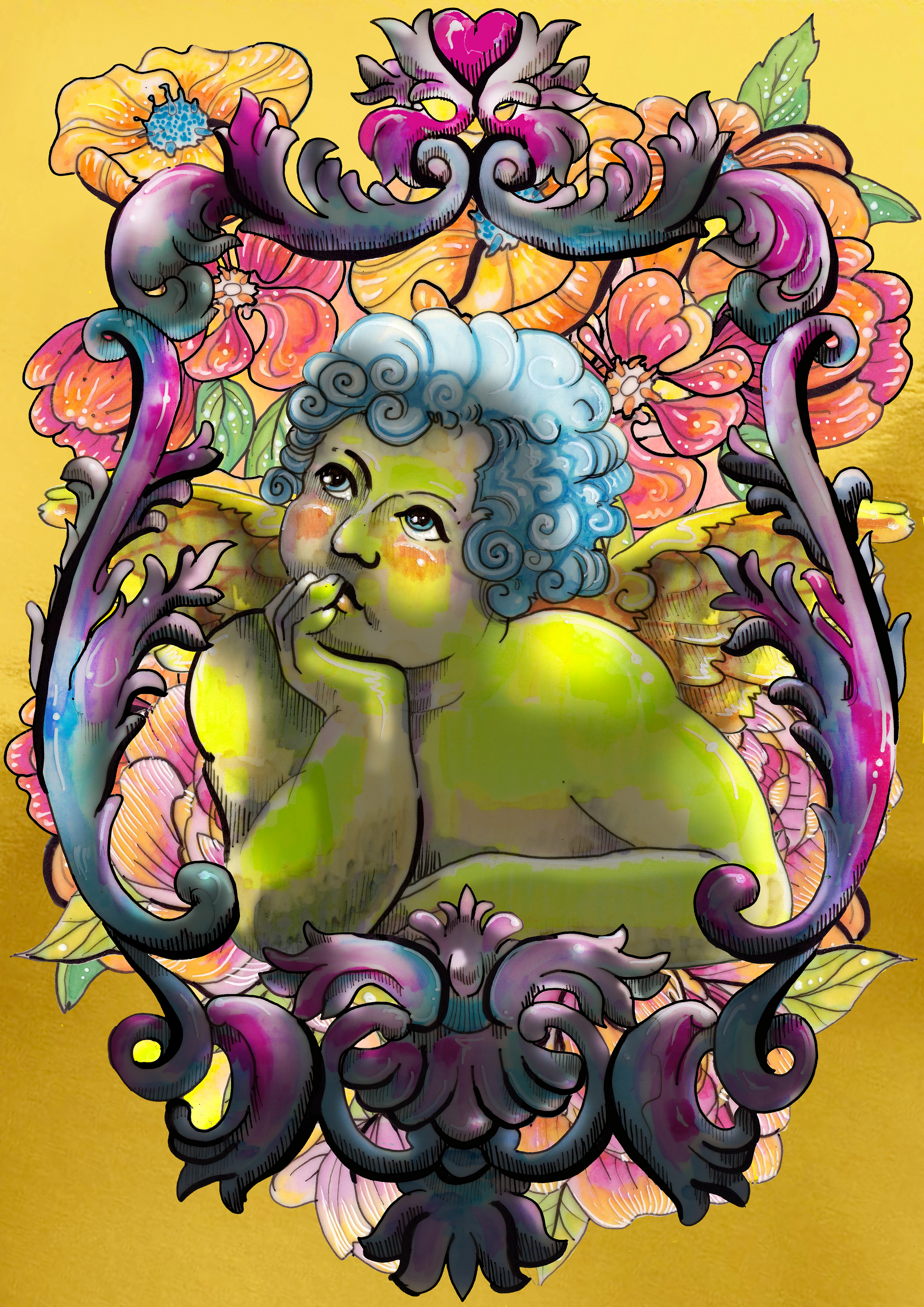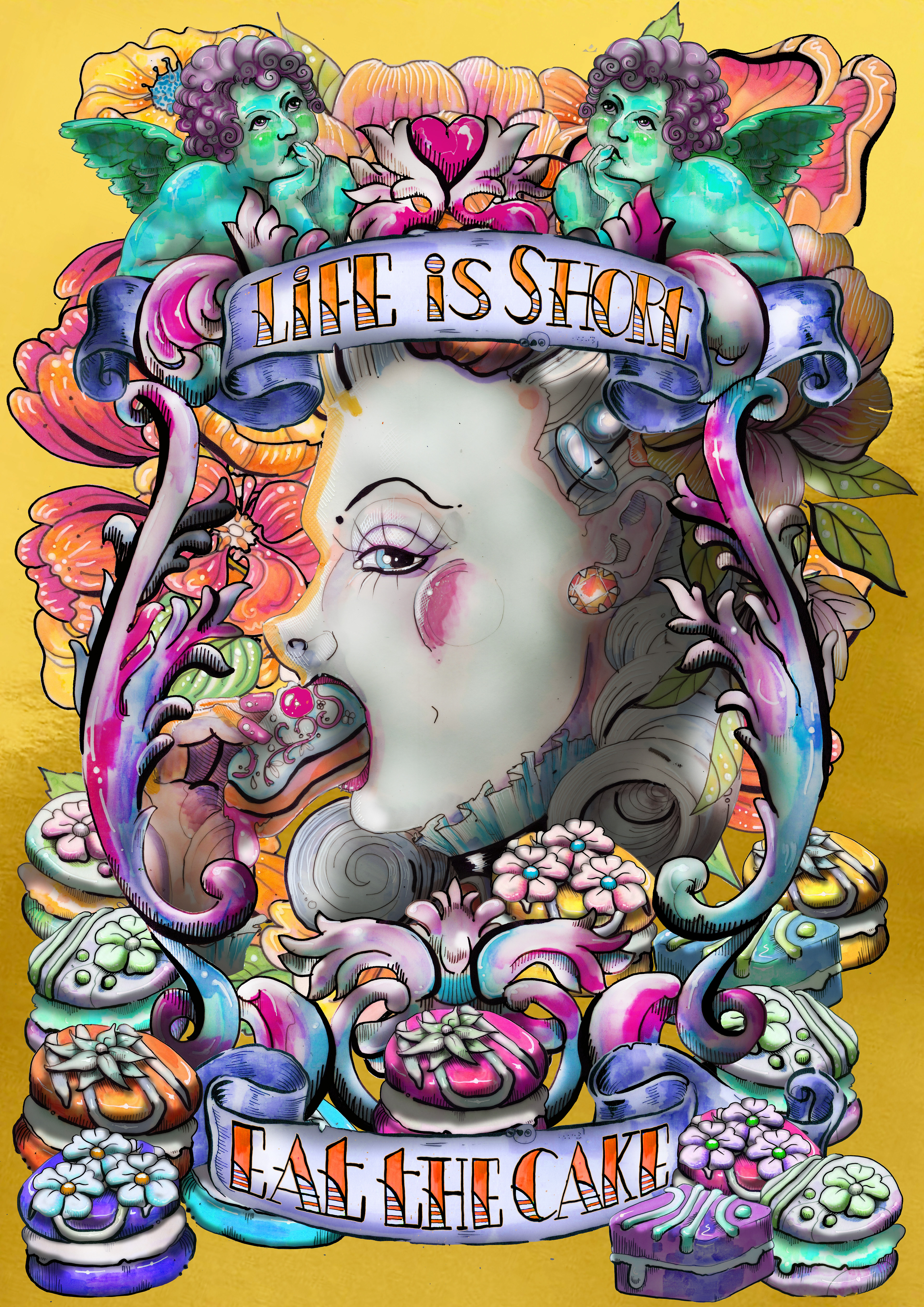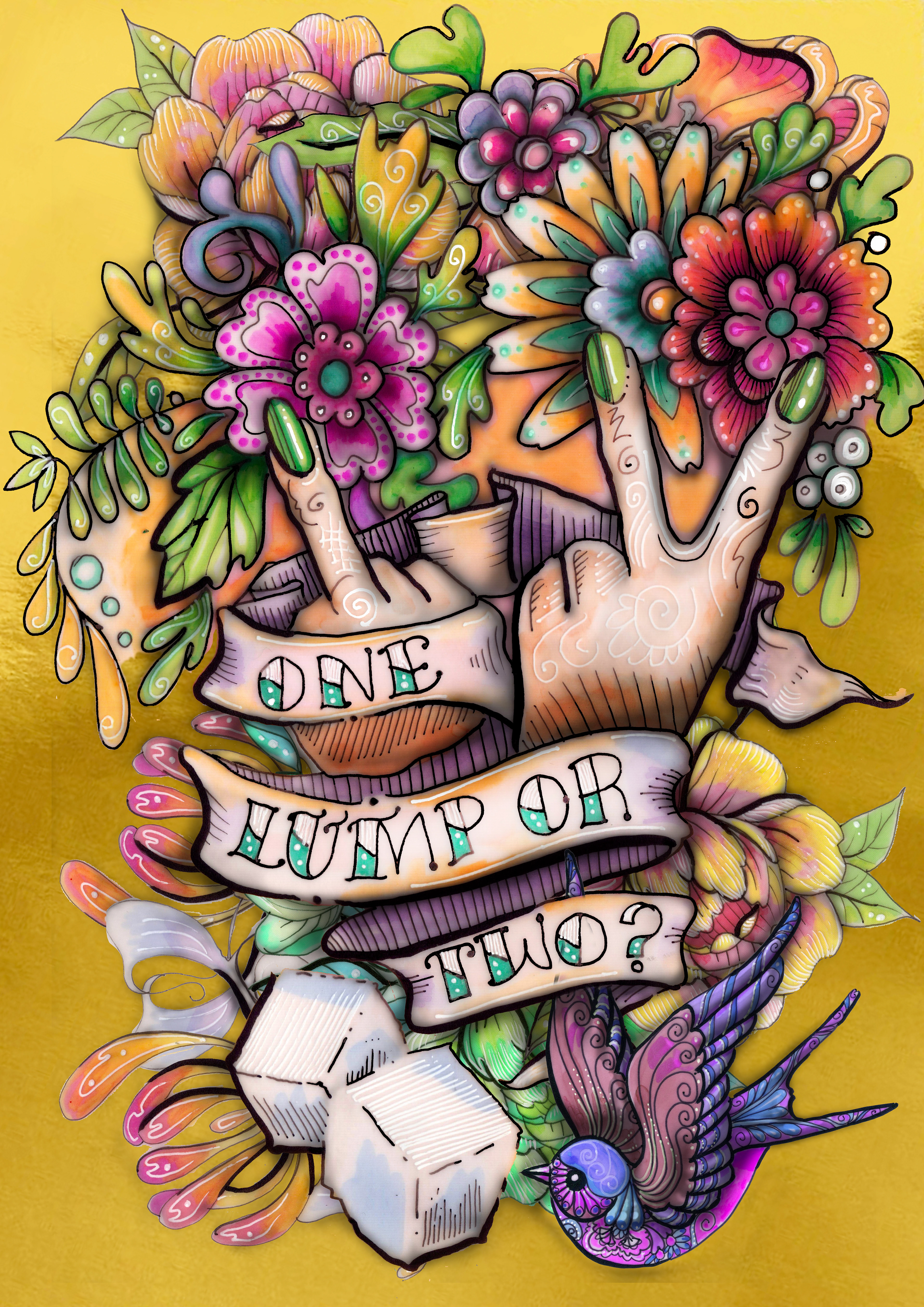 Drawing on tattoo culture and filled with a sense of humour and wit, this collection is hand drawn in pen and ink on tracing paper and then used to create digital collages full of light and colour.
