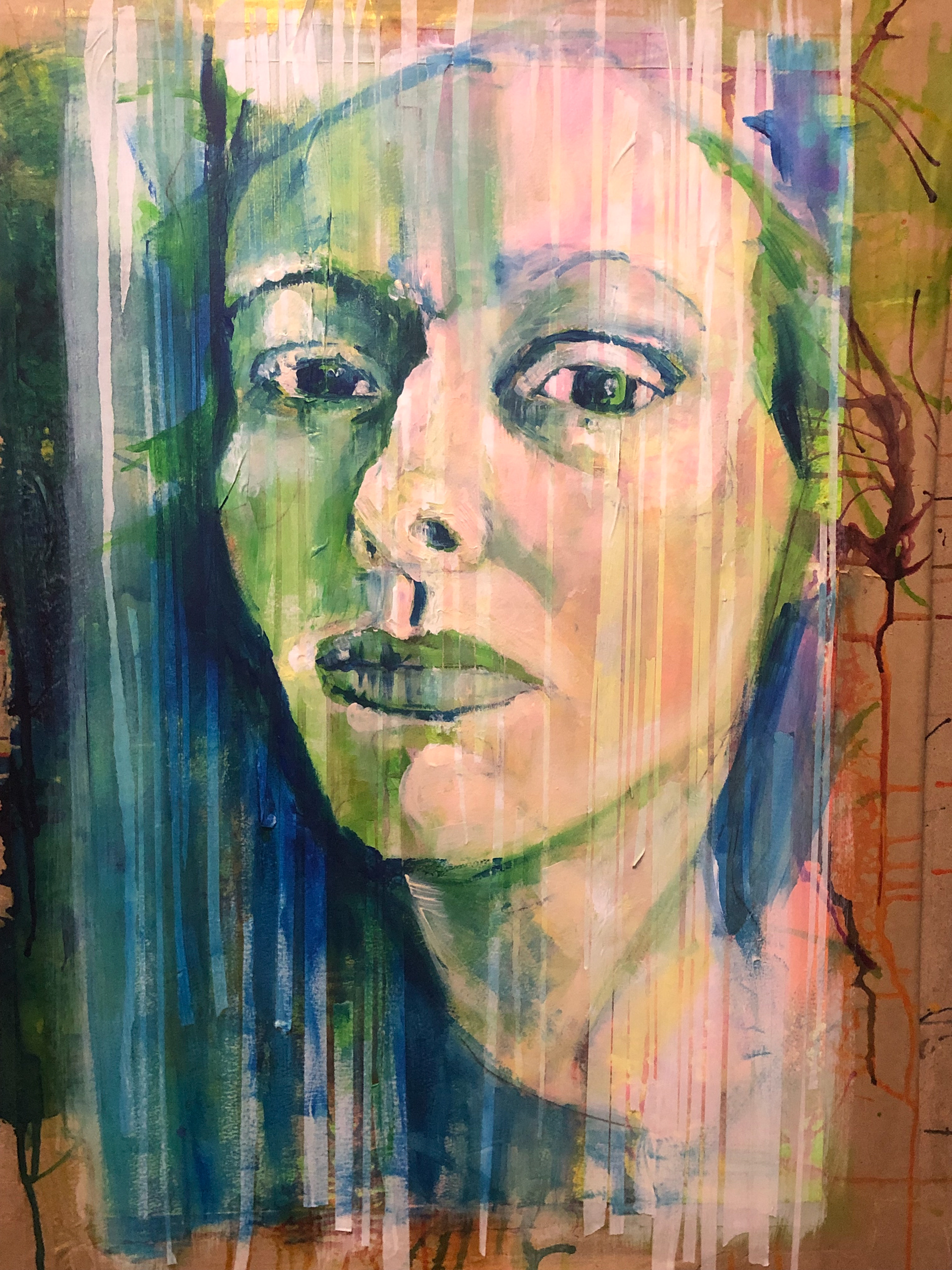 A part eroded portrait - created on a painted backdrop, which was then covered with masking tape strips. The face was then painted in acrylic, then part peeled away and worked over until the face is more memory and implication. The word 'Cyclonic' comes from the memory of falling asleep, dreaming and even making love to the shopping forecast on the radio, a sense of the storm of lingering emotion after the events have become jumbled and faded.